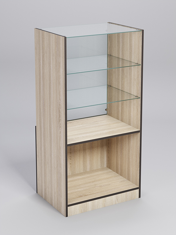 Стеклянные полки на прилавке используются для улучшения видимости товаров, так как они прозрачные. Это позволяет покупателям легко рассмотреть продукцию с разных ракурсов, особенно товары с высоким эстетическим или дизайнерским качеством. Полок две.