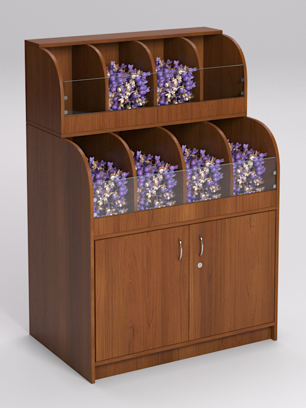 Элегантный стеллаж с округлыми контурами подойдет для вкусной весовой продукции: конфет, печенья, орехов.