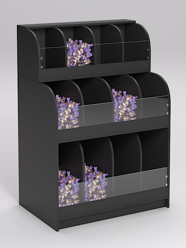 Элегантный стеллаж с округлыми контурами подойдет для вкусной весовой продукции: конфет, печенья, орехов.