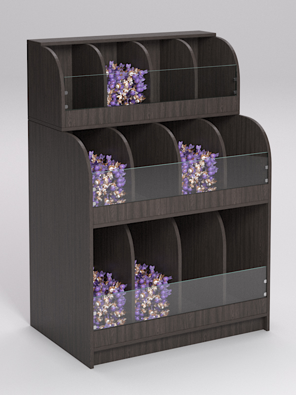 Элегантный стеллаж с округлыми контурами подойдет для вкусной весовой продукции: конфет, печенья, орехов.