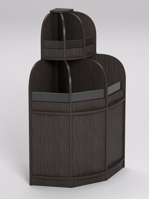 Стеллаж состоит из двух полок и высокого подиума. Каждая полка разделена полукруглыми перегородками на три секции. Спереди полки оборудованы прозрачными бортиками, предотвращающими падение продуктов. Ширина полок уменьшается от основания к вершине.