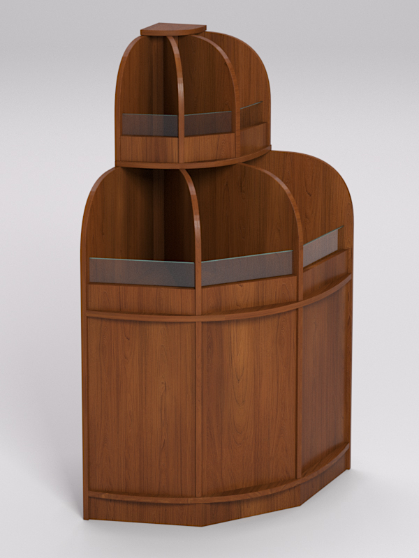 Элегантный стеллаж с округлыми контурами подойдет для вкусной весовой продукции: конфет, печенья, орехов. Угловая конструкция позволяет размещать стеллаж в небольшом помещении.