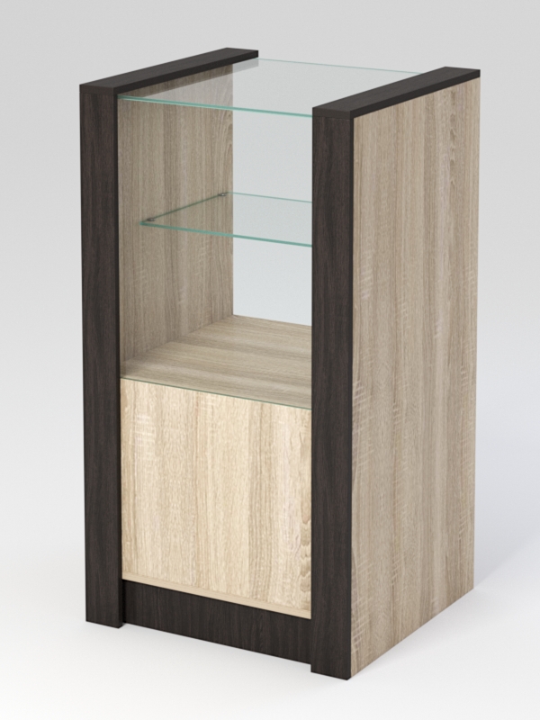 Прилавок №3-600 состоит из витрины и накопителя. Витрина содержит одну стеклянную полку. Доступ к витрине расположен со стороны продавца. Корпус изготовлен из ЛДСП. Каркас и накладки выполнены в контрастных цветах. Возможно изготовление в другом цветовом сочетании, из списка представленных на сайте цветов.