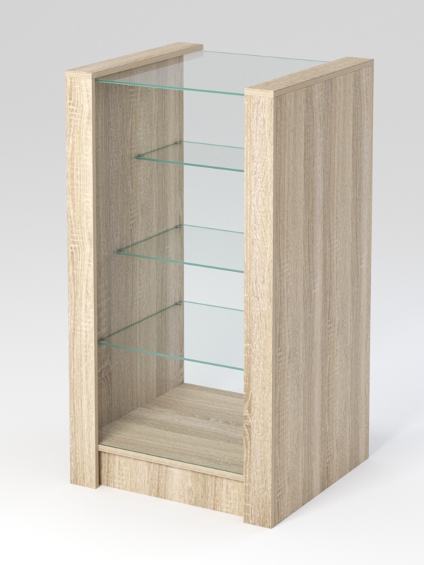 Крышка и передняя панель выполнены из стекла, боковины и цоколь — из ЛДСП. Внутри прилавка располагаются три стеклянные полки разной ширины.