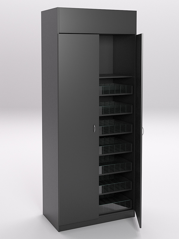 Стеллажи предназначены для хранения и продажи табачных изделий. Изготовлены из ЛДСП. Стеллаж представляет собой закрытый шкаф с дверцами, внутри которого располагаются выдвижные полки с разделителями и передним ограничителем из стекла.