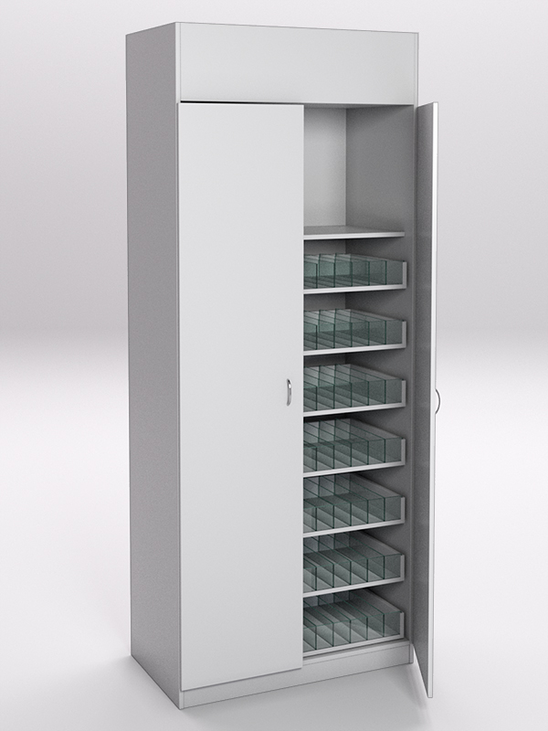 Стеллажи предназначены для хранения и продажи табачных изделий. Изготовлены из ЛДСП. Стеллаж представляет собой закрытый шкаф с дверцами, внутри которого располагаются выдвижные полки с разделителями и передним ограничителем из стекла.