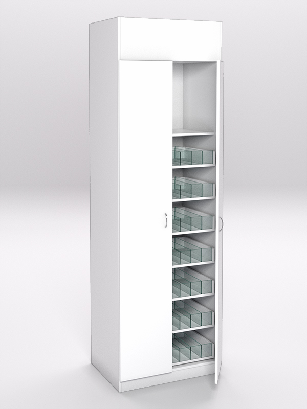 Стеллажи предназначены для хранения и продажи табачных изделий. Изготовлены из ЛДСП. Стеллаж представляет собой закрытый шкаф с дверцами, внутри которого располагаются выдвижные полки с разделителями и передним ограничителем из стекла.