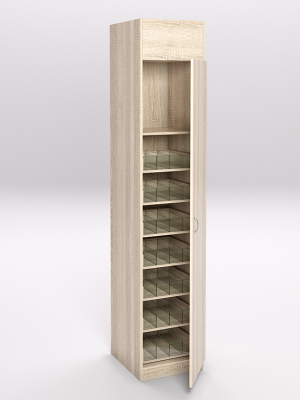 Стеллажи предназначены для хранения и продажи табачных изделий. Изготовлены из ЛДСП. Стеллаж представляет собой закрытый шкаф с дверцей, внутри которого располагаются выдвижные полки с разделителями и передним ограничителем из стекла.