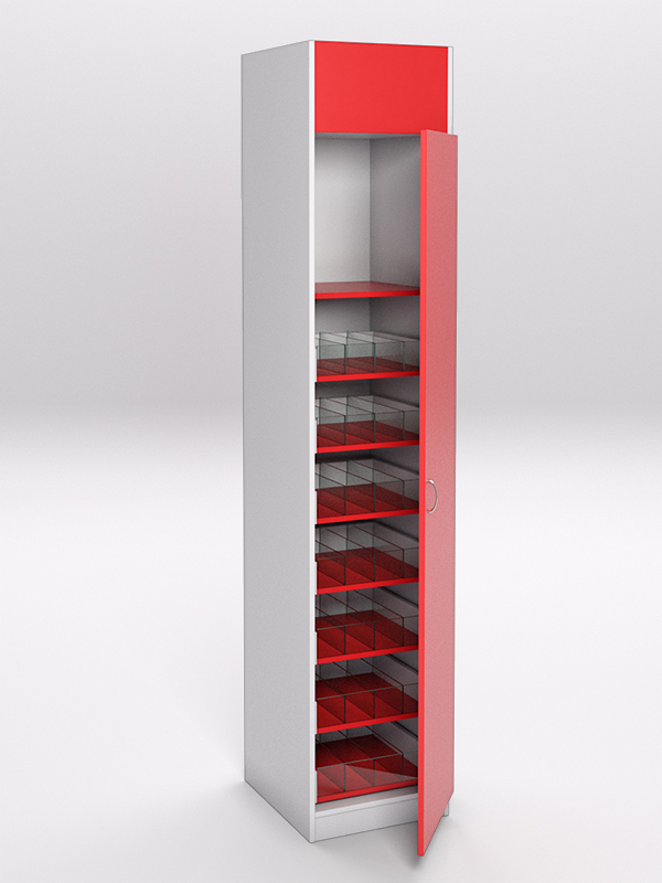 Стеллажи предназначены для хранения и продажи табачных изделий. Изготовлены из ЛДСП. Стеллаж представляет собой закрытый шкаф с дверцей, внутри которого располагаются выдвижные полки с разделителями и передним ограничителем из стекла.