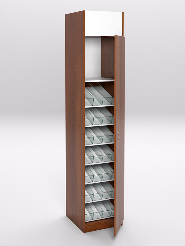 Стеллажи предназначены для хранения и продажи табачных изделий. Изготовлены из ЛДСП. Стеллаж представляет собой закрытый шкаф с дверцей, внутри которого располагаются наклонные полки с разделителями и передним ограничителем из стекла.
