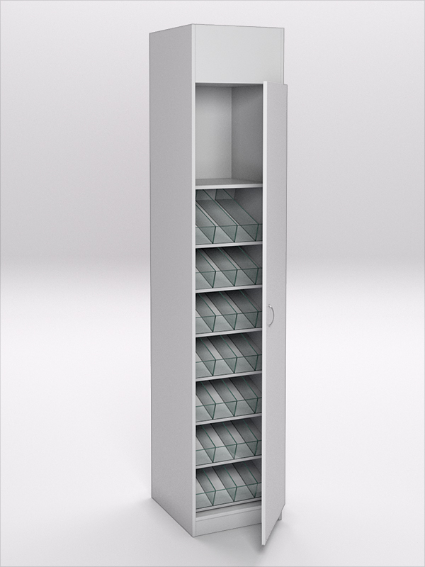 Стеллажи предназначены для хранения и продажи табачных изделий. Изготовлены из ЛДСП. Стеллаж представляет собой закрытый шкаф с дверцей, внутри которого располагаются наклонные полки с разделителями и передним ограничителем из стекла.