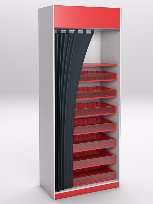 Стеллажи предназначены для хранения и продажи табачных изделий. Изготовлены из ЛДСП. Стеллаж представляет собой шкаф, внутри которого располагаются выдвижные полки с разделителями и передним ограничителем из стекла. Спереди шкаф завешивается шторой.