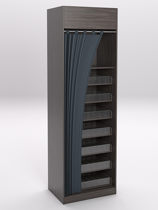 Стеллажи предназначены для хранения и продажи табачных изделий. Изготовлены из ЛДСП. Стеллаж представляет собой шкаф, внутри которого располагаются выдвижные полки с разделителями и передним ограничителем из стекла. Спереди шкаф завешивается шторой.