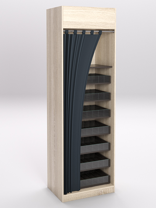 Стеллажи предназначены для хранения и продажи табачных изделий. Изготовлены из ЛДСП. Стеллаж представляет собой шкаф, внутри которого располагаются выдвижные полки с разделителями и передним ограничителем из стекла. Спереди шкаф завешивается шторой.