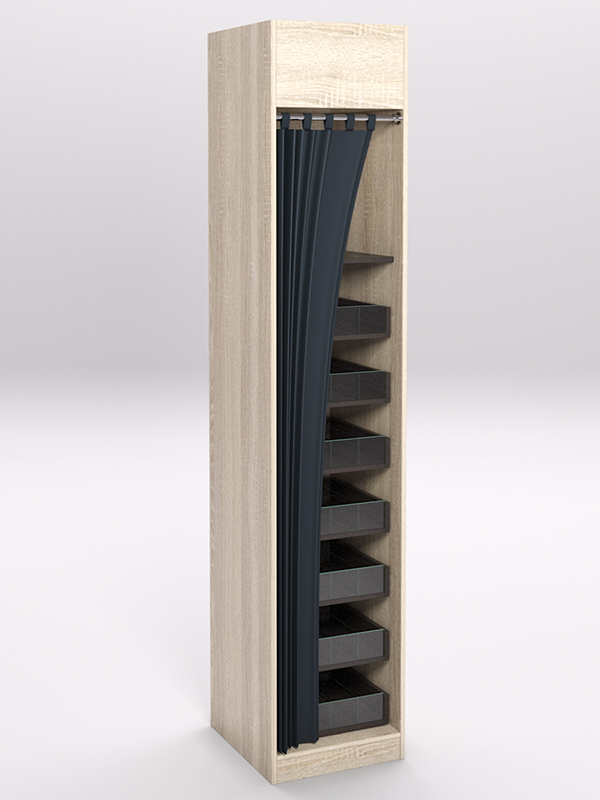 Стеллажи предназначены для хранения и продажи табачных изделий. Изготовлены из ЛДСП. Стеллаж представляет собой шкаф, внутри которого располагаются выдвижные полки с разделителями и передним ограничителем из стекла. Спереди шкаф завешивается шторой.