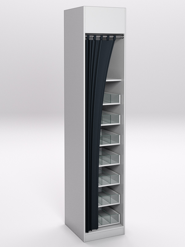 Стеллажи предназначены для хранения и продажи табачных изделий. Изготовлены из ЛДСП. Стеллаж представляет собой шкаф, внутри которого располагаются выдвижные полки с разделителями и передним ограничителем из стекла. Спереди шкаф завешивается шторой.
