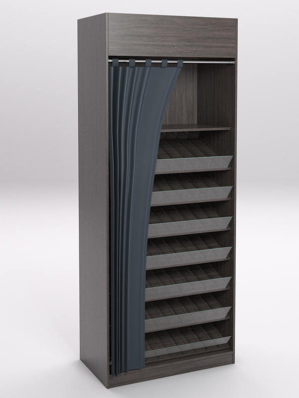 Стеллажи предназначены для хранения и продажи табачных изделий. Изготовлены из ЛДСП. Стеллаж представляет собой шкаф, внутри которого располагаются наклонные полки с разделителями и передним ограничителем из стекла. Спереди шкаф завешивается шторой.