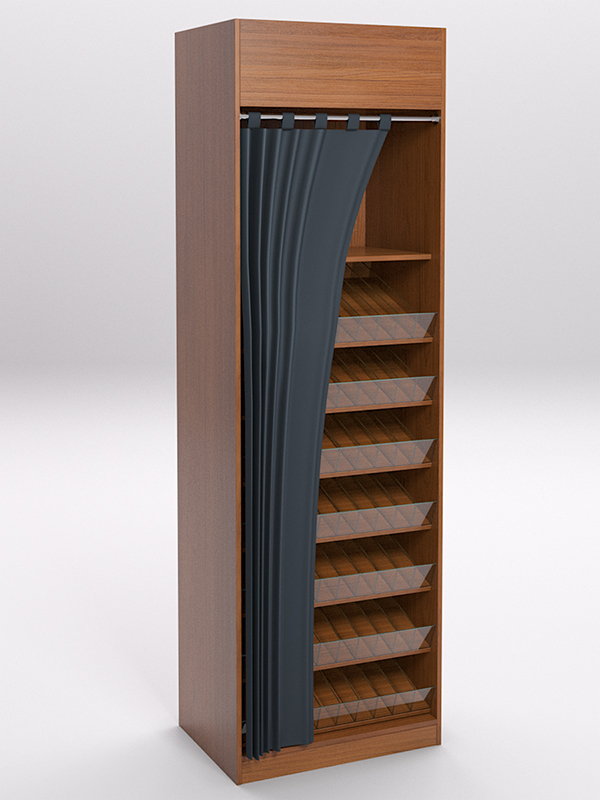 Стеллажи предназначены для хранения и продажи табачных изделий. Изготовлены из ЛДСП. Стеллаж представляет собой шкаф, внутри которого располагаются наклонные полки с разделителями и передним ограничителем из стекла. Спереди шкаф завешивается шторой.