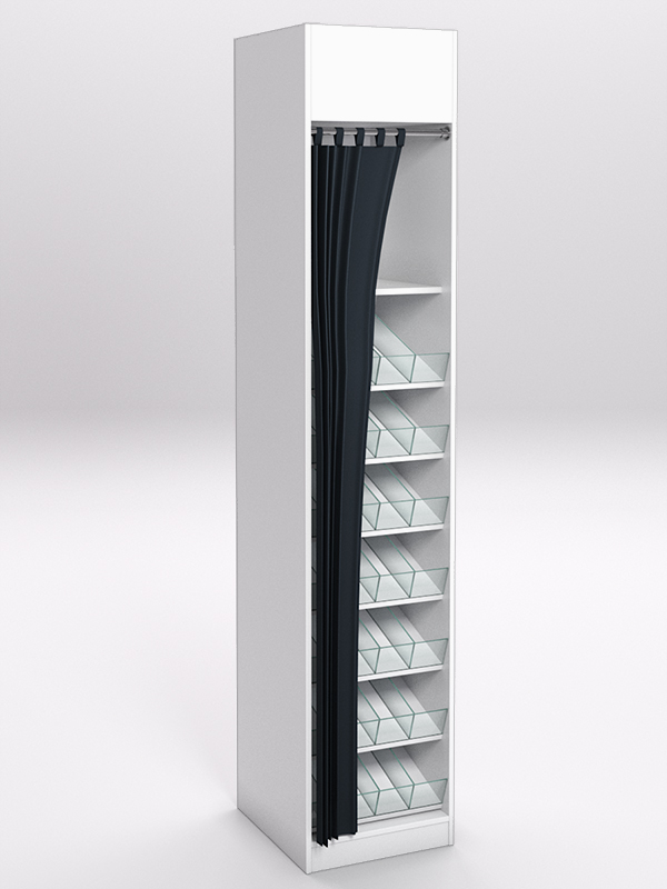 Стеллажи предназначены для хранения и продажи табачных изделий. Изготовлены из ЛДСП. Стеллаж представляет собой шкаф, внутри которого располагаются наклонные полки с разделителями и передним ограничителем из стекла. Спереди шкаф завешивается шторой.