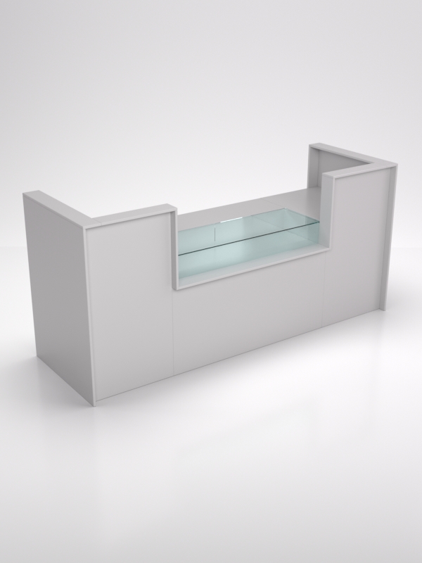 Стильная эргономичная стойка предназначена для полноценной офисной работы. Конструкция оборудована большим количеством тумб и полок, где можно расположить офисную технику и другой служебный инвентарь. Внутреннее оборудование полностью скрыто от взгляда посетителя. Приемная зона представлена горизонтальной стеклянной панелью.