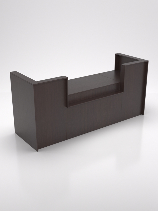 Стильная эргономичная стойка предназначена для полноценной офисной работы. Конструкция оборудована большим количеством тумб и полок, где можно расположить офисную технику и другой служебный инвентарь. Внутреннее оборудование полностью скрыто от взгляда посетителя. Приемная зона представлена горизонтальной панелью.