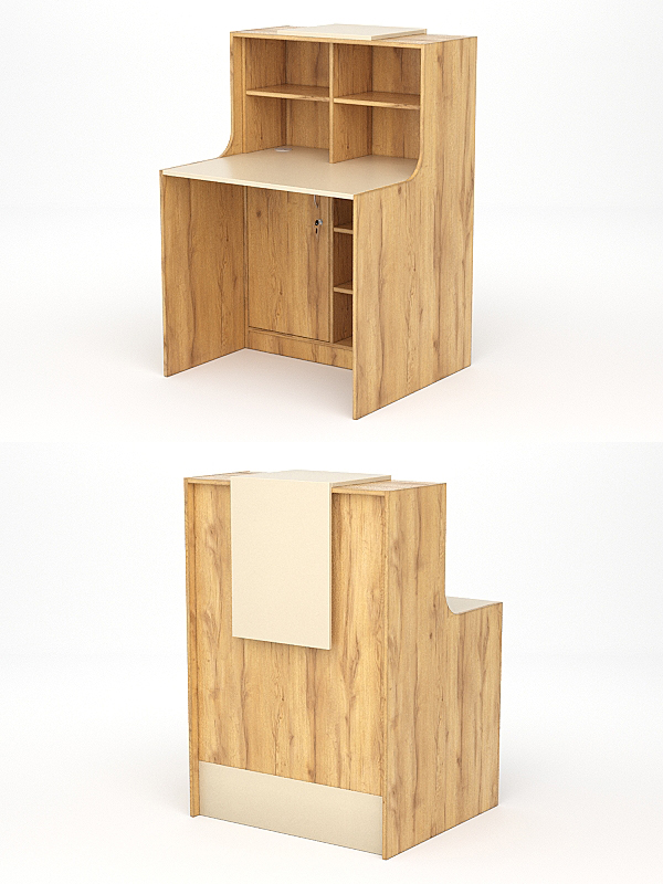В верхней секции ресепшена предусмотрены полки, а в нижней его секции находится тумба с левой стороны и две полки с правой.