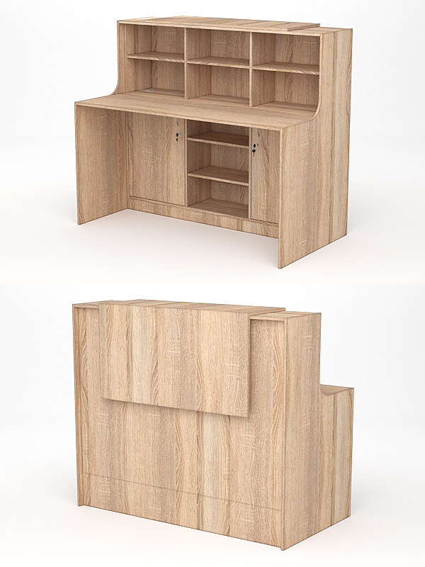 Стойка оборудована под одно рабочее место. Конструкция включает две столешницы: для посетителей и администратора.