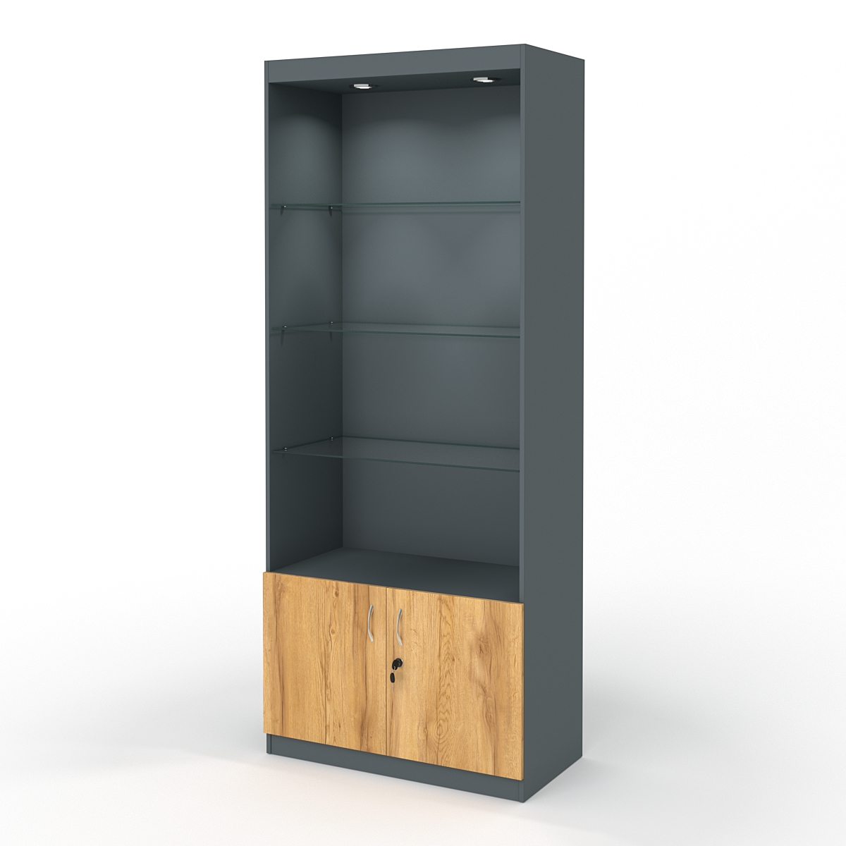 В нижней части имеется полка накопитель, которая закрывается на двери с ключами. В такой конструкции можно хранить запасные товары, заказы на выдачу, документы или сопутствующие к работе предметы.