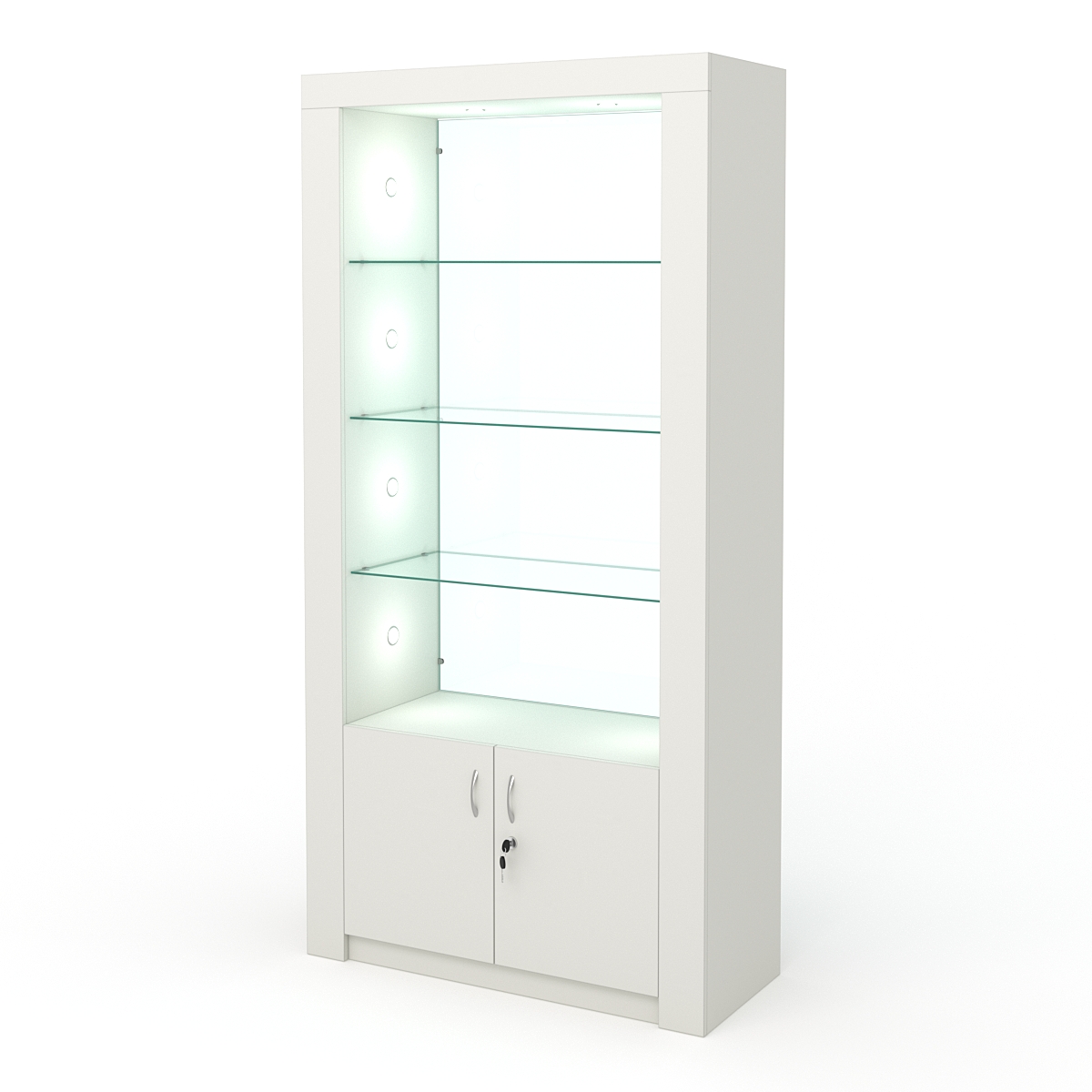 Стеллаж оснащен подсветкой из 10 светильников. 4е светильника расположены по бокам витрины, 2а светильника расположены сверху.