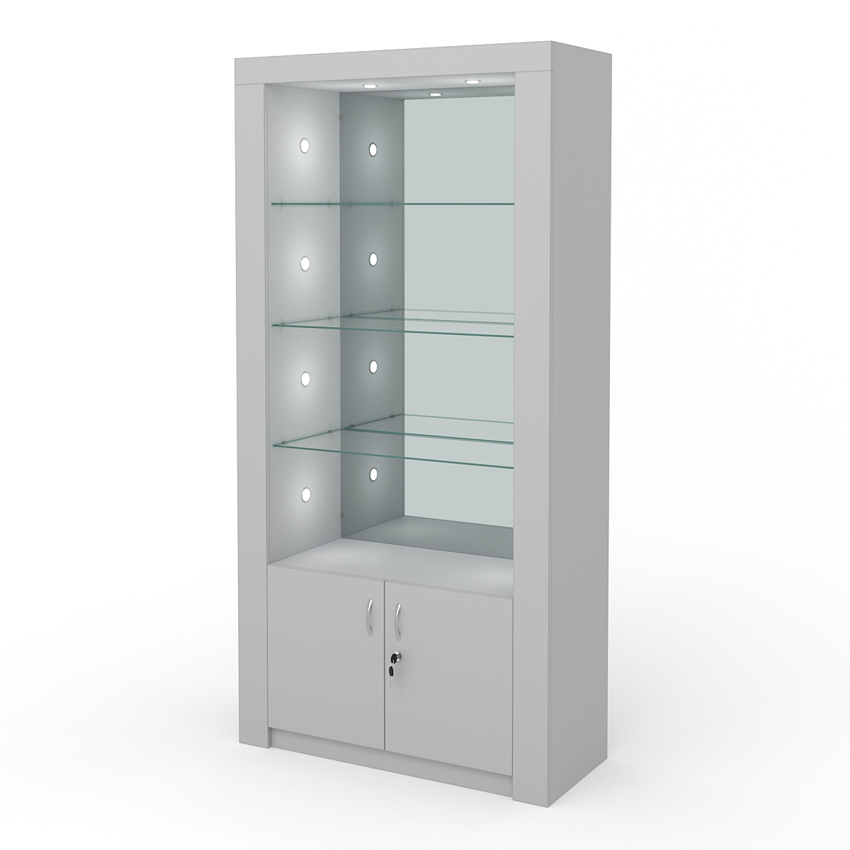 В нижней части имеется полка накопитель, которая закрывается на двери с ключами. В такой конструкции можно хранить запасные товары, заказы на выдачу, документы или сопутствующие к работе предметы.