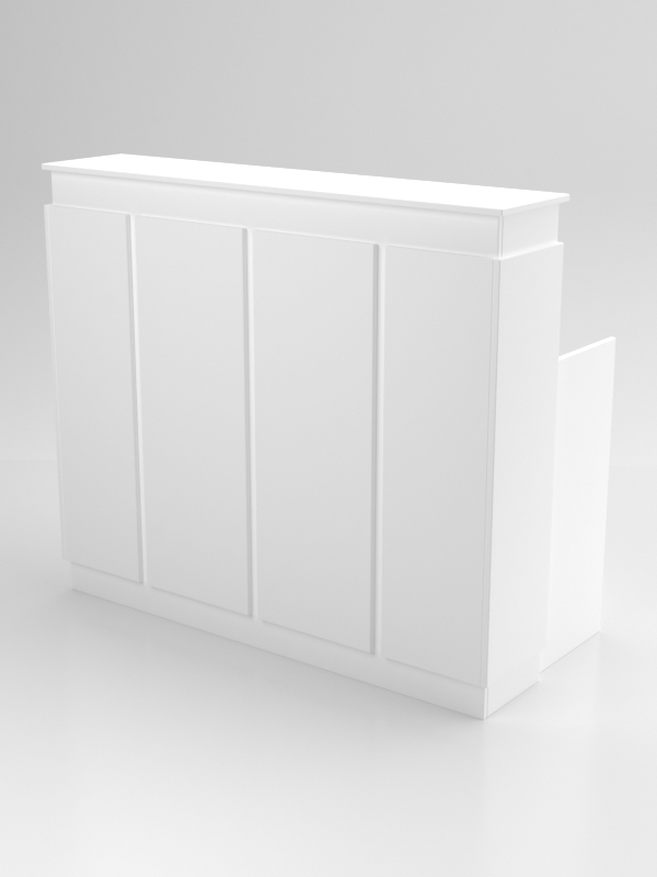 Конструкция состоит из стойки с верхней столешницей и стола администратора. Внешняя поверхность украшена декоративными накладками. Цвет накладок и стола контрастирует с цветом стойки.