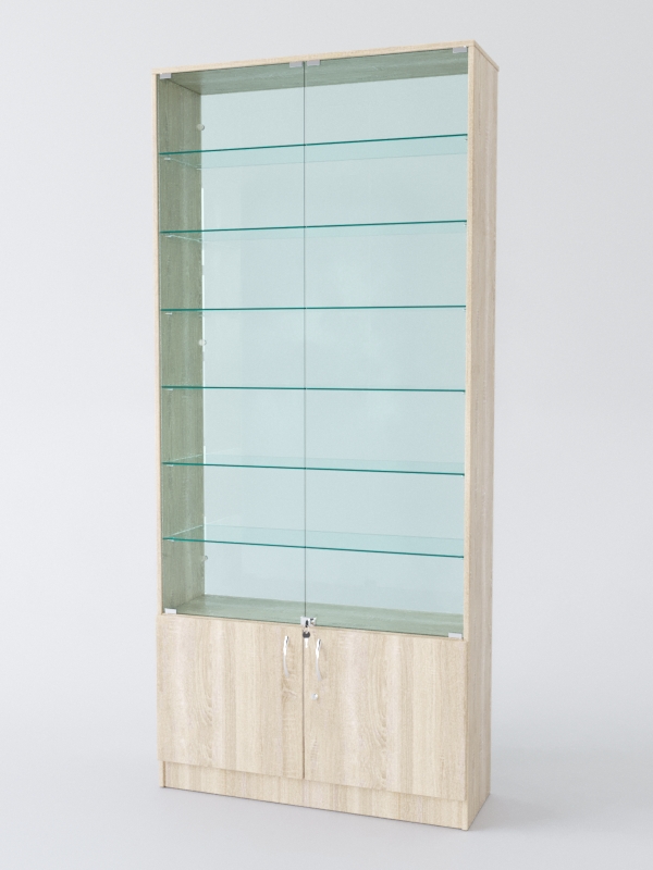 Задняя стенка стеклянная. Такая деталь помогает создать более привлекательный вид витрины и улучшает ее функциональность.