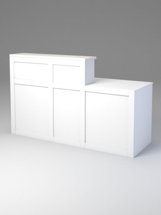 Конструкция имеет закрытый фасад с декоративной верхней столешницей. Столешница изготовлена из влагостойкой ЛДСП толщиной 38мм. С внутренней стороны стойки имеется столешница для бармена, а также шесть отделений для хранения инвентаря. Слева расположена открытая тумба с двумя отделениями. При необходимости, на тумбу устанавливается витрина с полками.