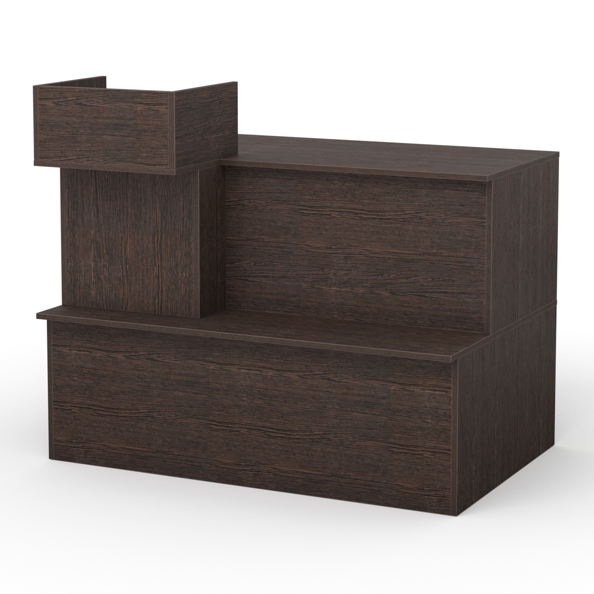Кассовый стол имеет широкое применение в магазинах одежды, обуви, сумок. За таким столом удобно производить расчет с покупателями, выдавать товары. Стол содержит широкую столешницу, на которой слева расположено отделение для кассового аппарата. Со стороны покупателя имеется просторная полка для сумок. Внутри находится два больших и три малых отделения для хранения товара. Каркас выполнен из ЛДСП. Цвет подбирается в вариантах стандарт и на заказ.