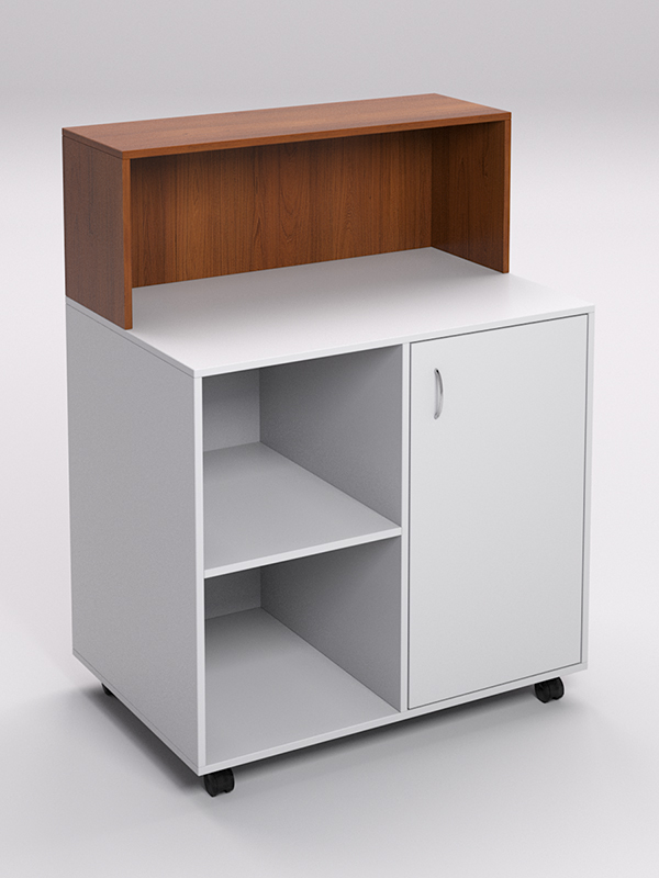 Барная стойка предназначена для приготовления напитков и обслуживания клиентов в баре. Конструкция включает две столешницы. Верхняя столешница предназначена для обслуживания посетителей, нижняя — для приготовления напитков. Внутренняя часть стойки содержит два открытых отделения и одно отделение с дверкой. Основание стойки оборудовано колесами. Каркас и столешница выполнены из ЛДСП 16мм, кромка 1мм ПВХ. Цвет подбирается в вариантах стандарт и на заказ.