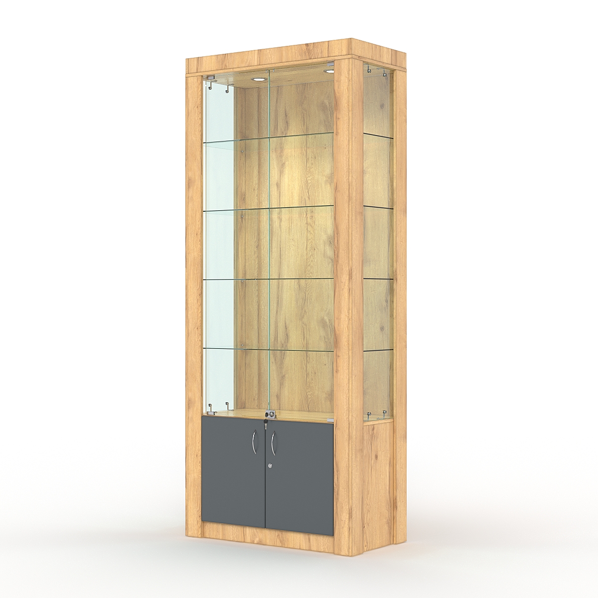 Стеклянные дверки в верхней секции — стекло 5мм, закрываются на замок.
