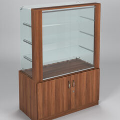 Модель Пекарь №4 включает витрину и накопитель. Каркас прилавка выполнен из ЛДСП. Витрина представляет собой стеклянный шкаф с раздвижными дверцами, располагающимися со стороны продавца. Внутри находится три полки. Накопитель оборудован распашными дверцами, закрывающимися на ключ.