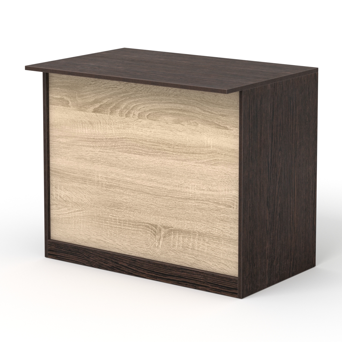Стол для записей и расчетов при осуществлении сделки между продавцом и покупателем. Фасад закрытый. Вверху расположена широкая столешница, выступающая вперед. С внутренней стороны фасада, внизу, находится полка. Каркас выполнен из ЛДСП двух цветов. Цвет подбирается в вариантах стандарт и на заказ.