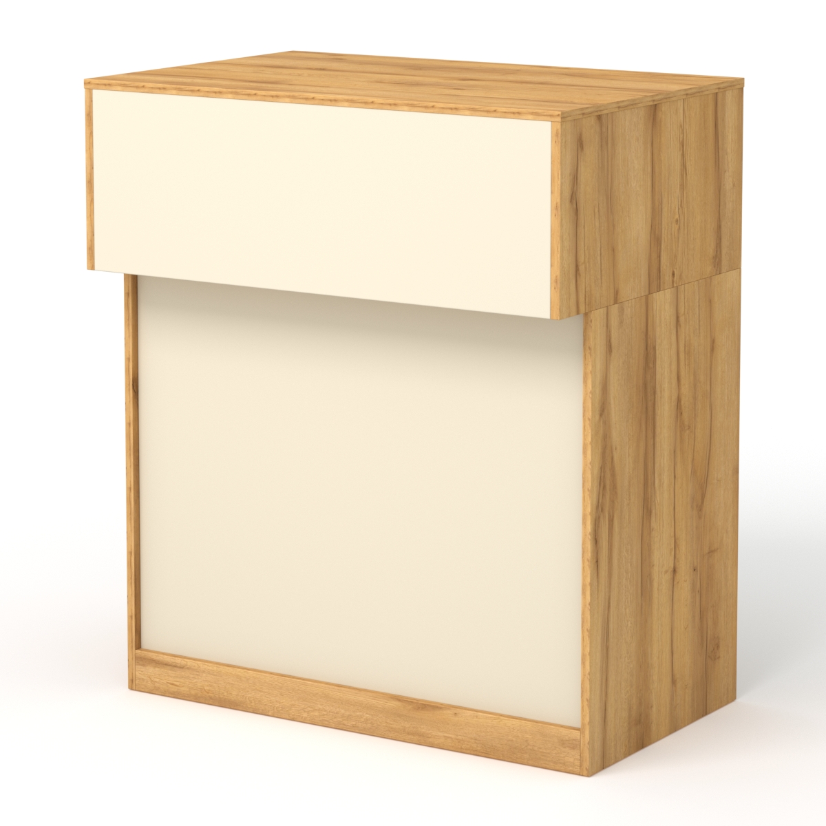 Прилавок подойдет для размещения кассового аппарата, ведения расчетов, а также демонстрации товаров покупателю. Конструкция имеет закрытый фасад. Верхняя часть фасада со столешницей выдвинута вперед. С внутренней стороны фасада находится отделение с полкой для кассового аппарата и нижняя полка. Каркас выполнен из ЛДСП. Цвет подбирается в вариантах стандарт и на заказ.