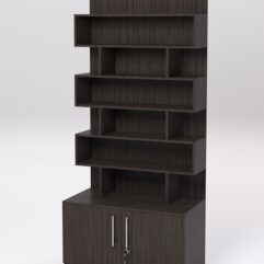 Конструкция состоит из стеллажа и тумбы с полкой. Тумба оборудована распашными дверками с замком. Полки стеллажа соединены друг с другом вертикальными стенками, в результате получается шесть отделений. Широкие отделения чередуются с узкими, благодаря чему конструкция смотрится оригинально и непринужденно. Крыша стеллажа используется в качестве полки. Задняя стенка выступает за крышу стеллажа, создавая колоритный фон для размещенных на ней товаров.
