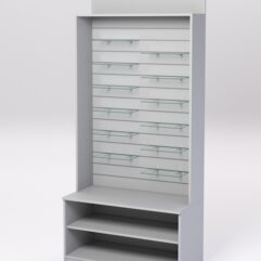 Конструкция состоит из стеллажа и тумбы с полкой. Задняя стенка имеет пазы для крепления полок. Прозрачные полки из стекла расположены поочередно, в два ряда. В качестве дополнительных полок используются крыши и основание. Задняя стенка выступает за крышу стеллажа, создавая колоритный фон для размещенных на ней товаров.