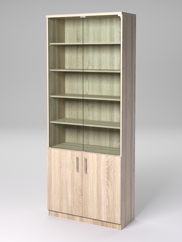 Каркас из ДСП. Верхняя часть закрывается на стеклянные дверцы, внутри — четыре полки из ДСП. Внизу находится закрытый шкаф с дверцами из ДСП.