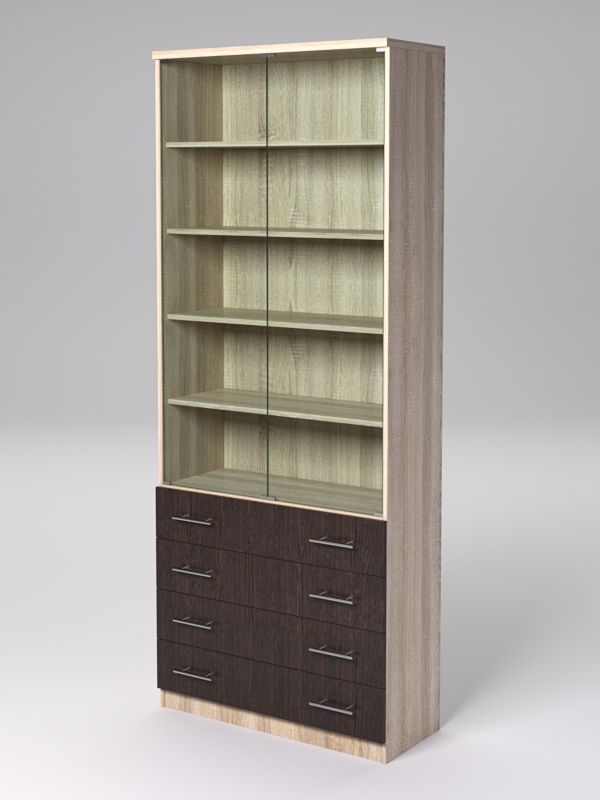 Каркас из ДСП. Верхняя часть закрывается на стеклянные дверцы, внутри — четыре полки из ДСП. Внизу находится четыре выдвижных ящика.