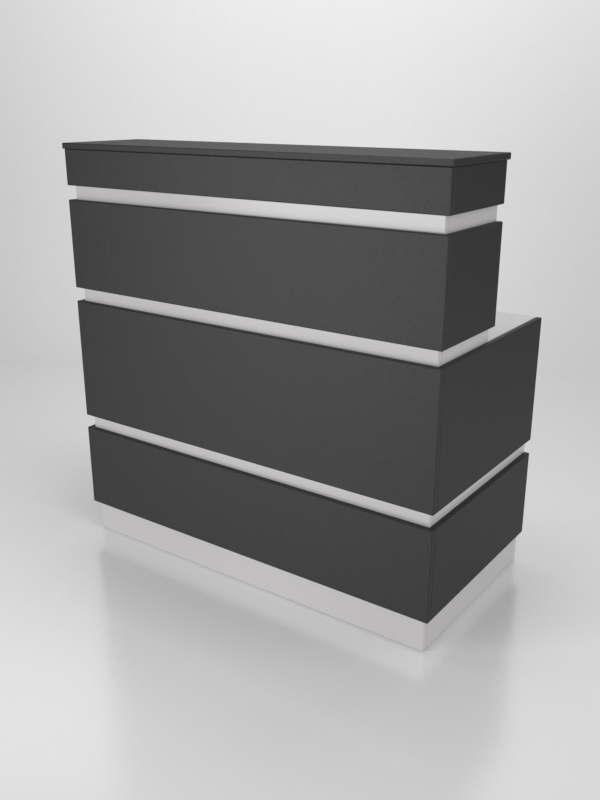 Наша модель ресепшена имеет прямоугольную форму, выполнена в экстравагантном сочетании серого и красного цветов. Габариты стойки позволяют разместить ее в небольшом помещении. Конструкция имеет две столешницы. Верхняя предназначена для посетителей, нижняя служит рабочим местом администратора.