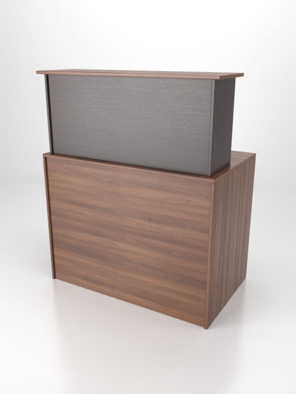 Представленная модель ресепшен выполнена из ЛДСП двух цветов. Такой прием позволяет зрительно разграничить зону посетителей от зоны администратора. Модель имеет две столешницы. Верхняя предназначена для приема посетителей, нижняя — для работы администратора. Здесь располагается оргтехника, документы, канцелярские принадлежности.
