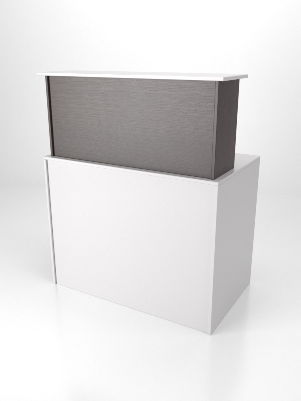 Представленная модель ресепшен выполнена из ЛДСП двух цветов. Такой прием позволяет зрительно разграничить зону посетителей от зоны администратора. Модель имеет две столешницы. Верхняя предназначена для приема посетителей, нижняя — для работы администратора. Здесь располагается оргтехника, документы, канцелярские принадлежности.