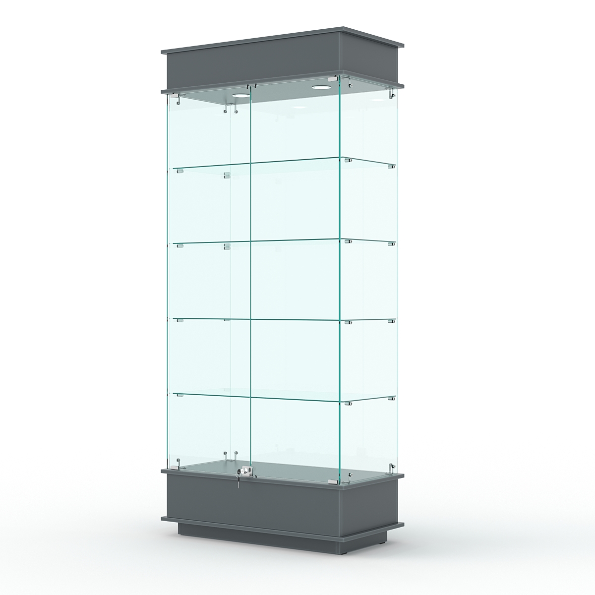 Конструкция включает четыре стеклянных полки и подиум из ЛДСП. Корпус оборудован распашными дверцами с замком. В верхнем фризе имеется подсветка.