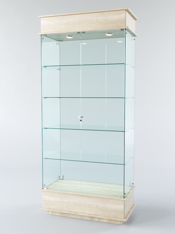 Конструкция включает четыре стеклянных полки и подиум из ЛДСП. Корпус оборудован распашными дверцами с замком. В верхнем фризе имеется подсветка.