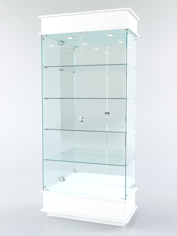 Конструкция включает четыре стеклянных полки и подиум из ЛДСП. Задняя стенка — зеркало. Корпус оборудован распашными дверцами с замком. В верхнем фризе имеется подсветка.