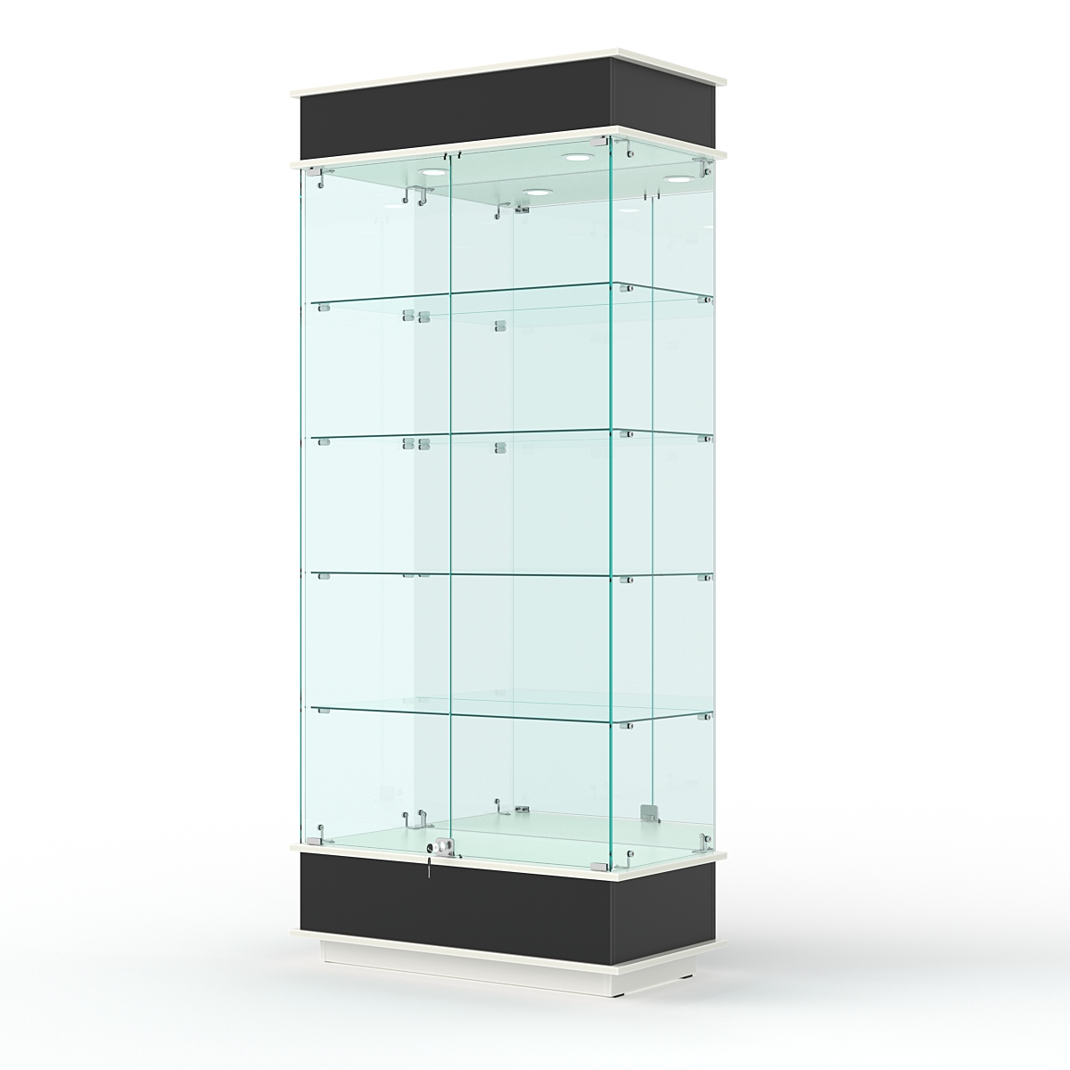 Конструкция включает четыре стеклянных полки и подиум из ЛДСП. Задняя стенка — зеркало. Корпус оборудован распашными дверцами с замком. В верхнем фризе имеется подсветка.